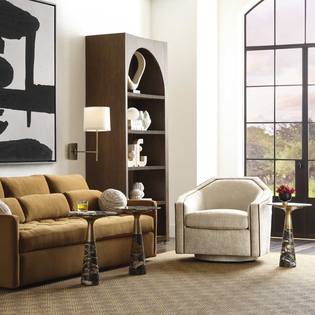 The Repartee Swivel Chair features a welt trim that accentuates the jewel-like shape of the back and arms.