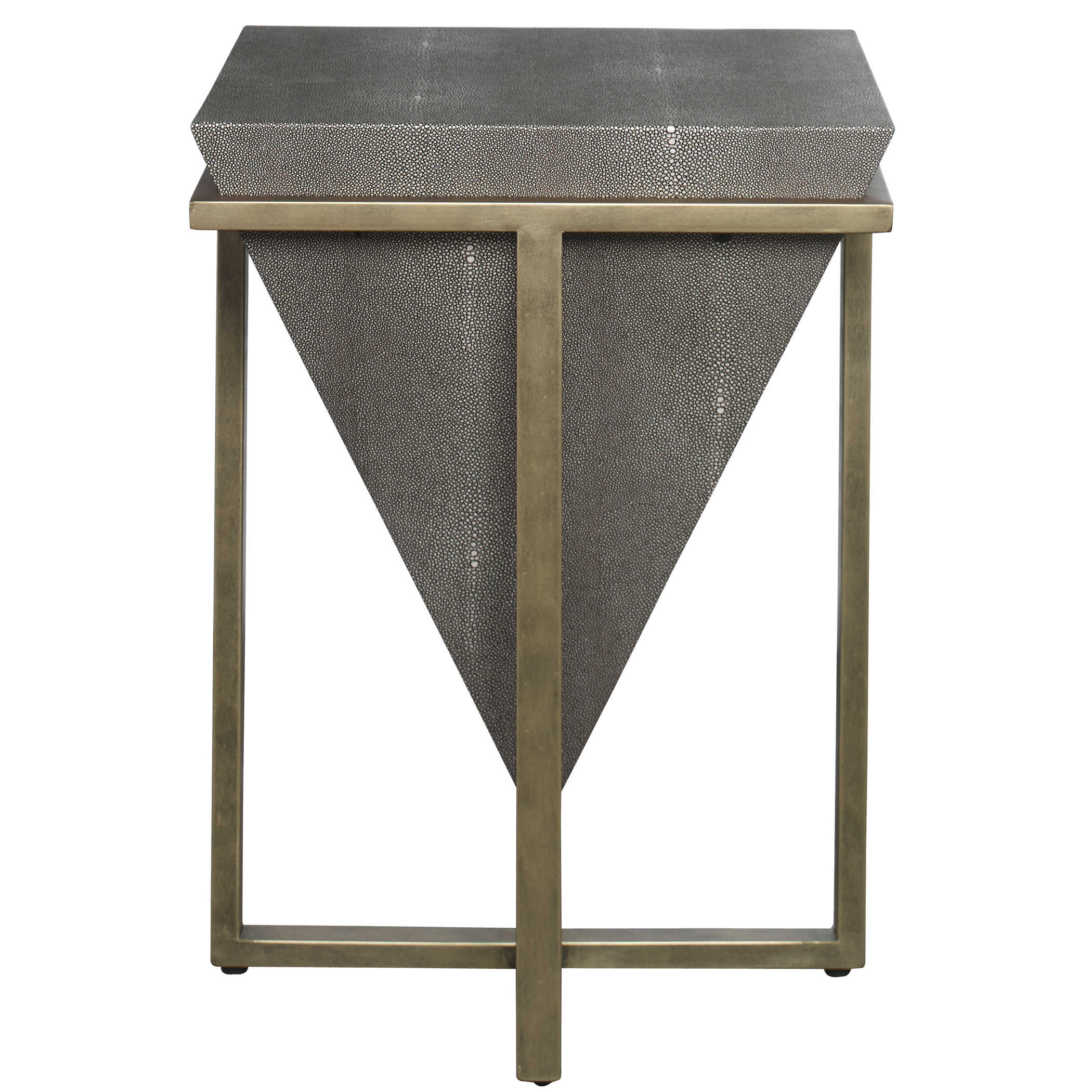 This upside down pyramid is finished in a rich mushroom gray faux shagreen, nestled into an iron base finished in aged gold.