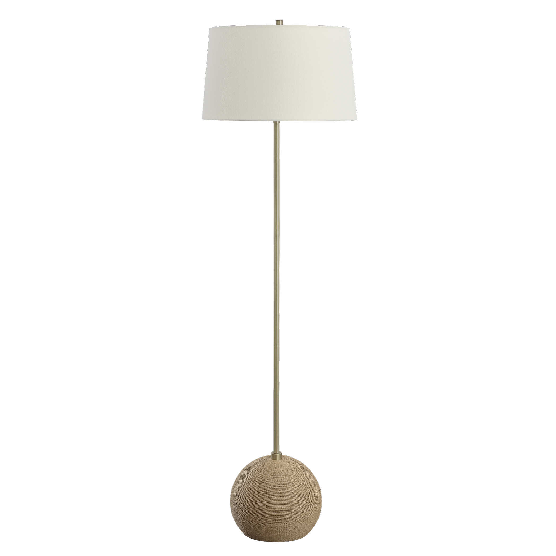 This floor lamp features a casual, natural braided rattan wrapped foot accented by antique brass plated iron base. A slightly tapered hardback shade in a crisp white linen fabric complements the piece.