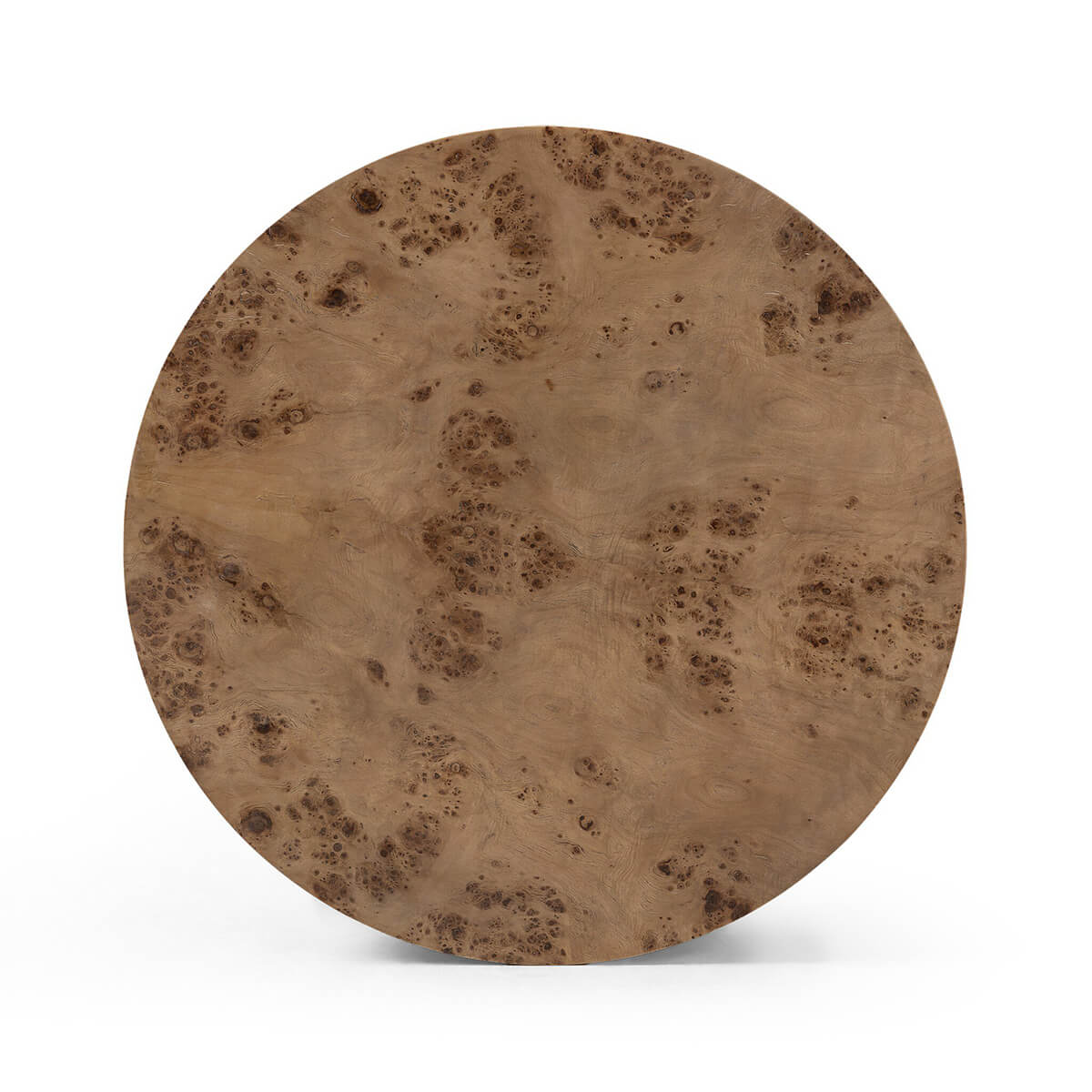 Simple drum shaping showcases the natural artistry of the richly grained caramel burl veneer. Its compact size is ideal for smaller spaces.