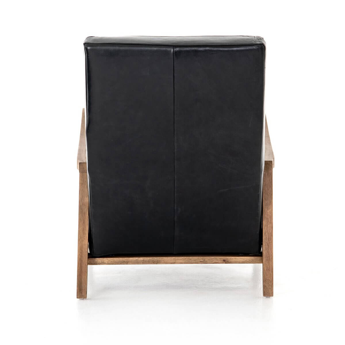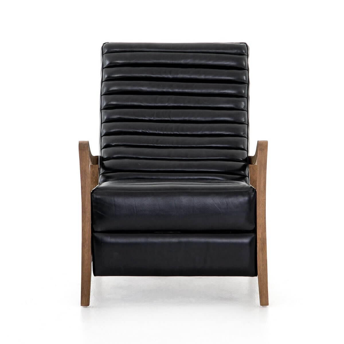 A dramatically shaped mid-century frame, modernized by channel tufting. Black top-grain leather contrasts with natural parawood, for a clean, cool look with vintage airs. A push recliner takes this forward-thinking lounger to the next level.