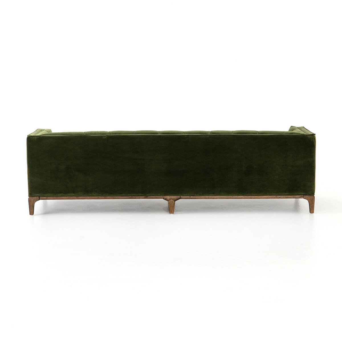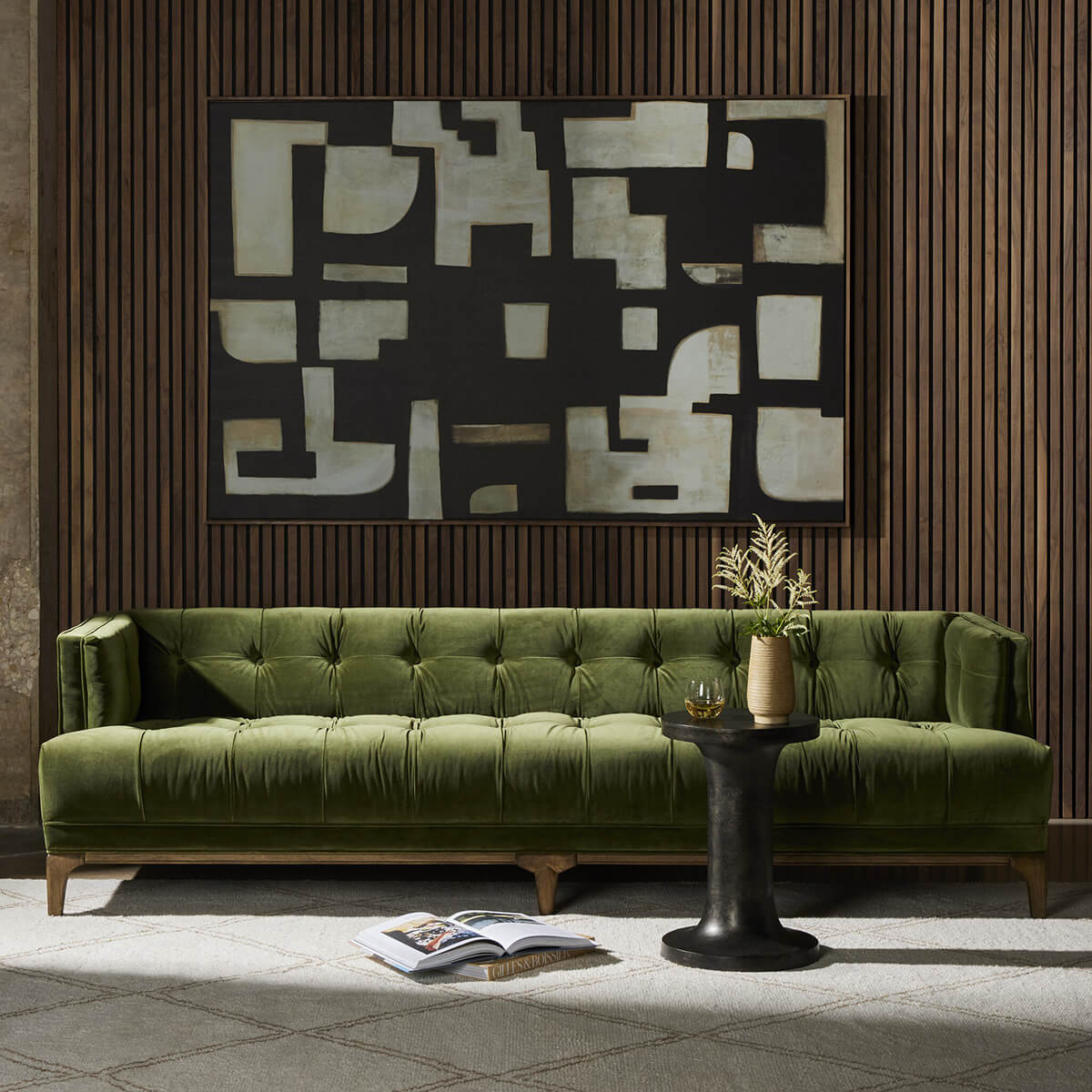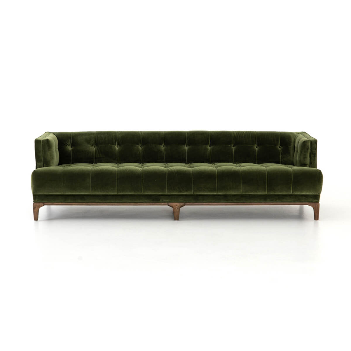 A low, tight mid-century silhouette in an intriguing sapphire olive features clean-lined arms and dramatic blind tufting.