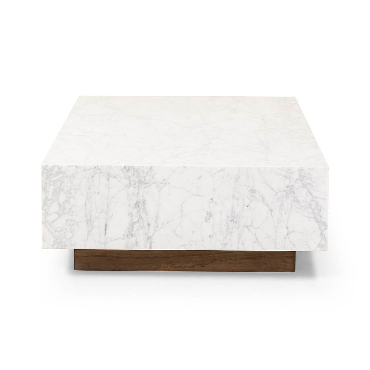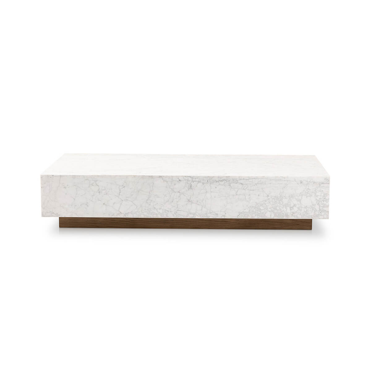 A white Carrara marble slab, rich with veining and movement. Supported by a wooden plinth, marble takes the spotlight in a design that’s simple and sophisticated at once.