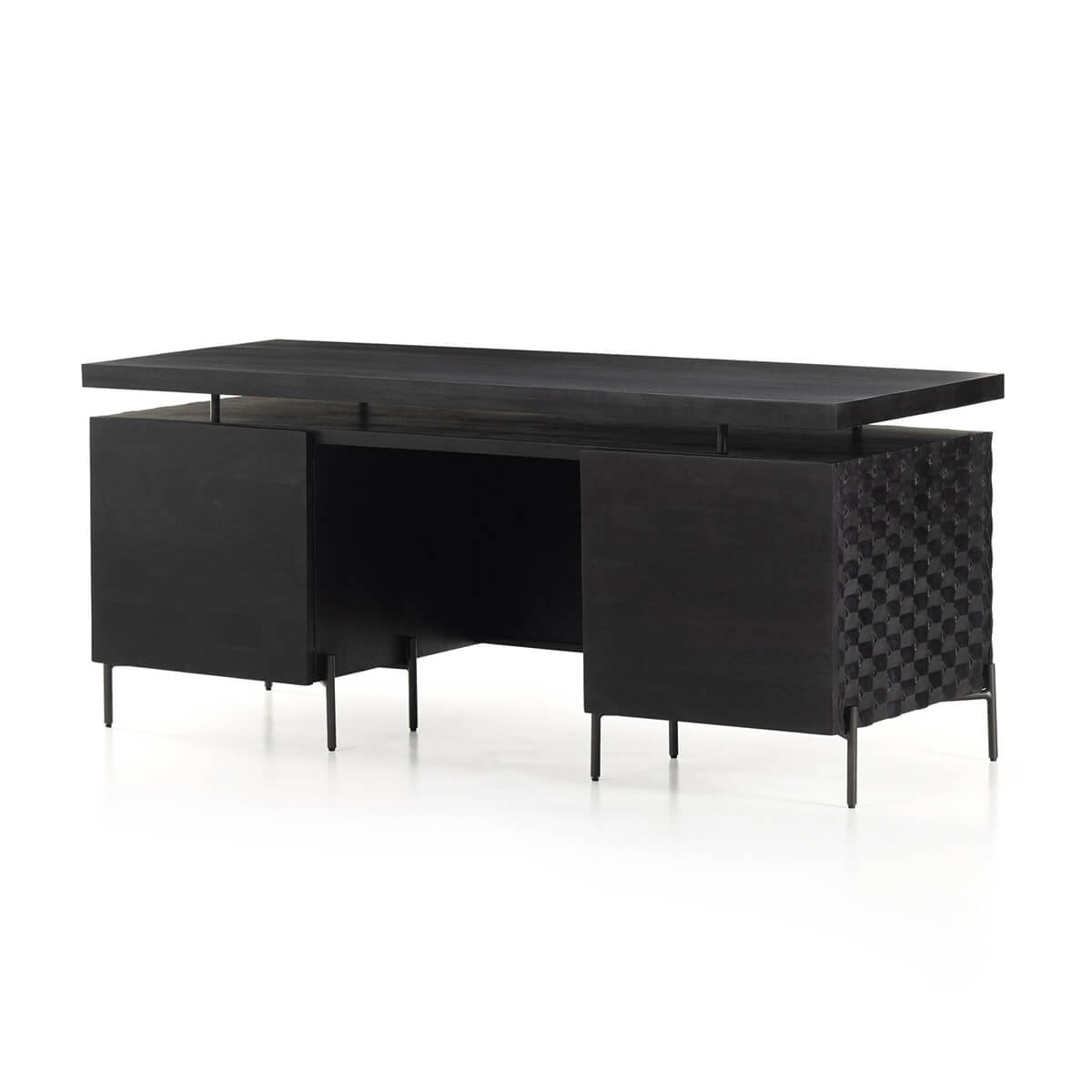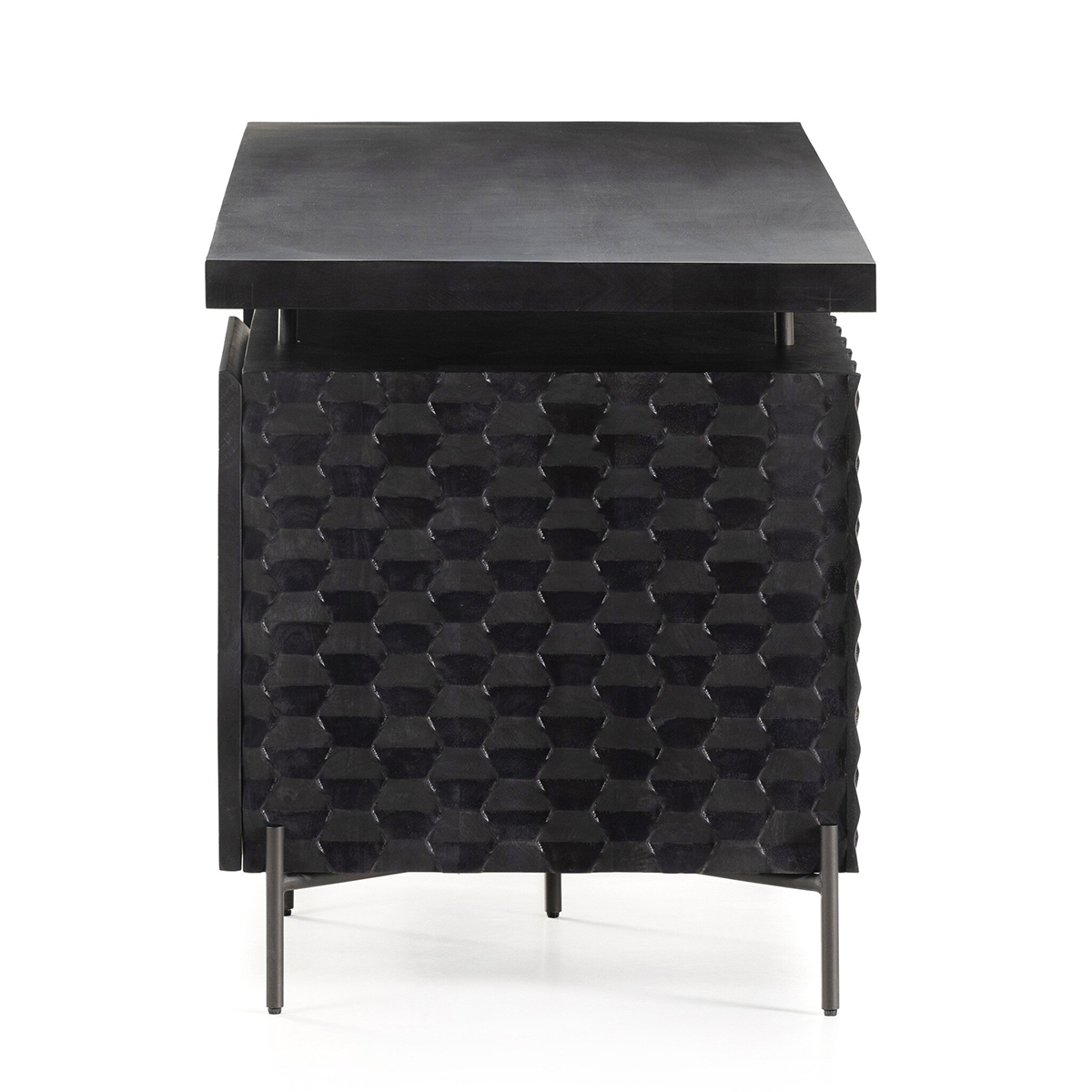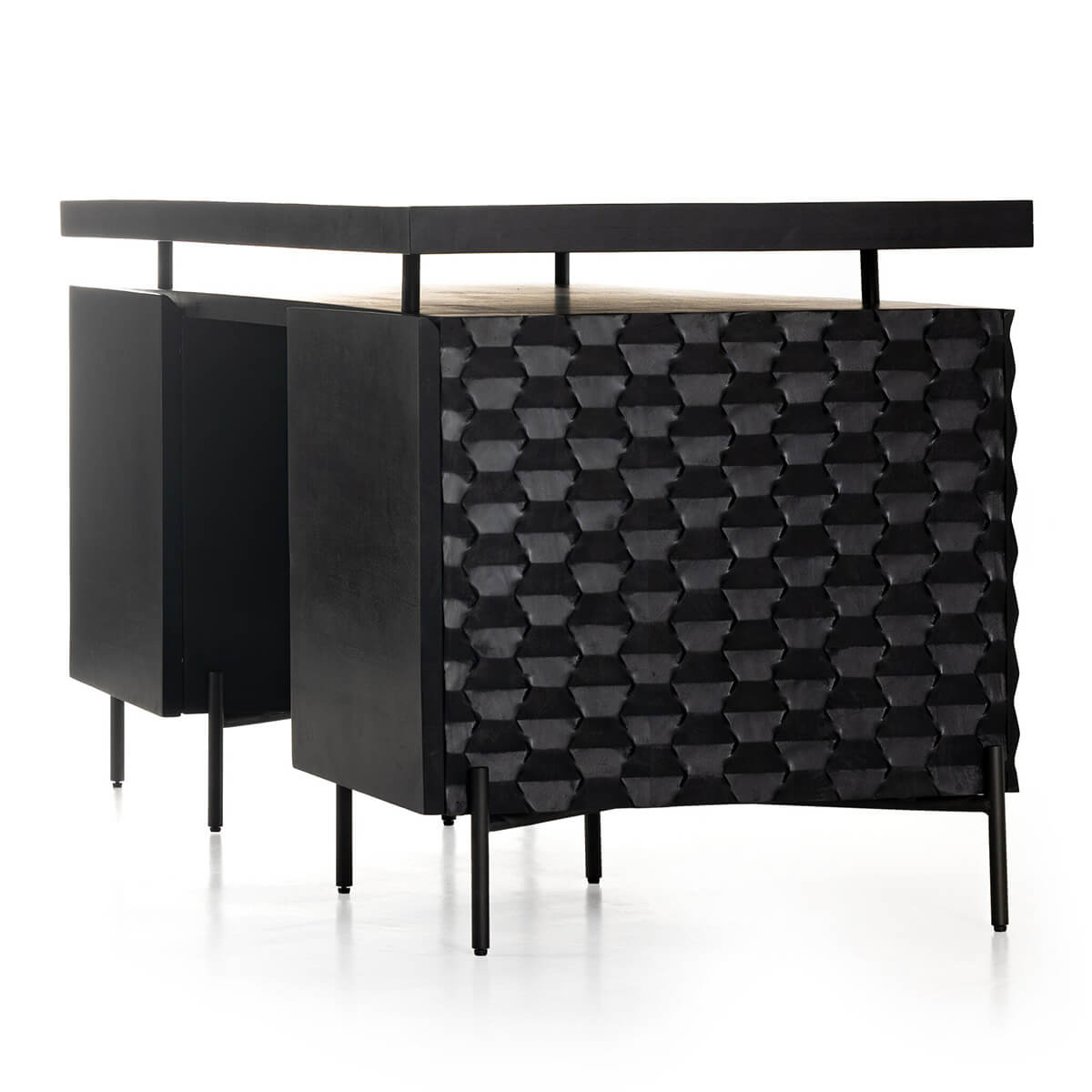 A black-washed two-tier desk features intricate carving for a uniquely textured look and float-like feel. Gunmetal-finished iron legs offer an intriguing material mix with a modern touch.