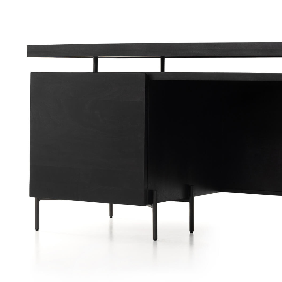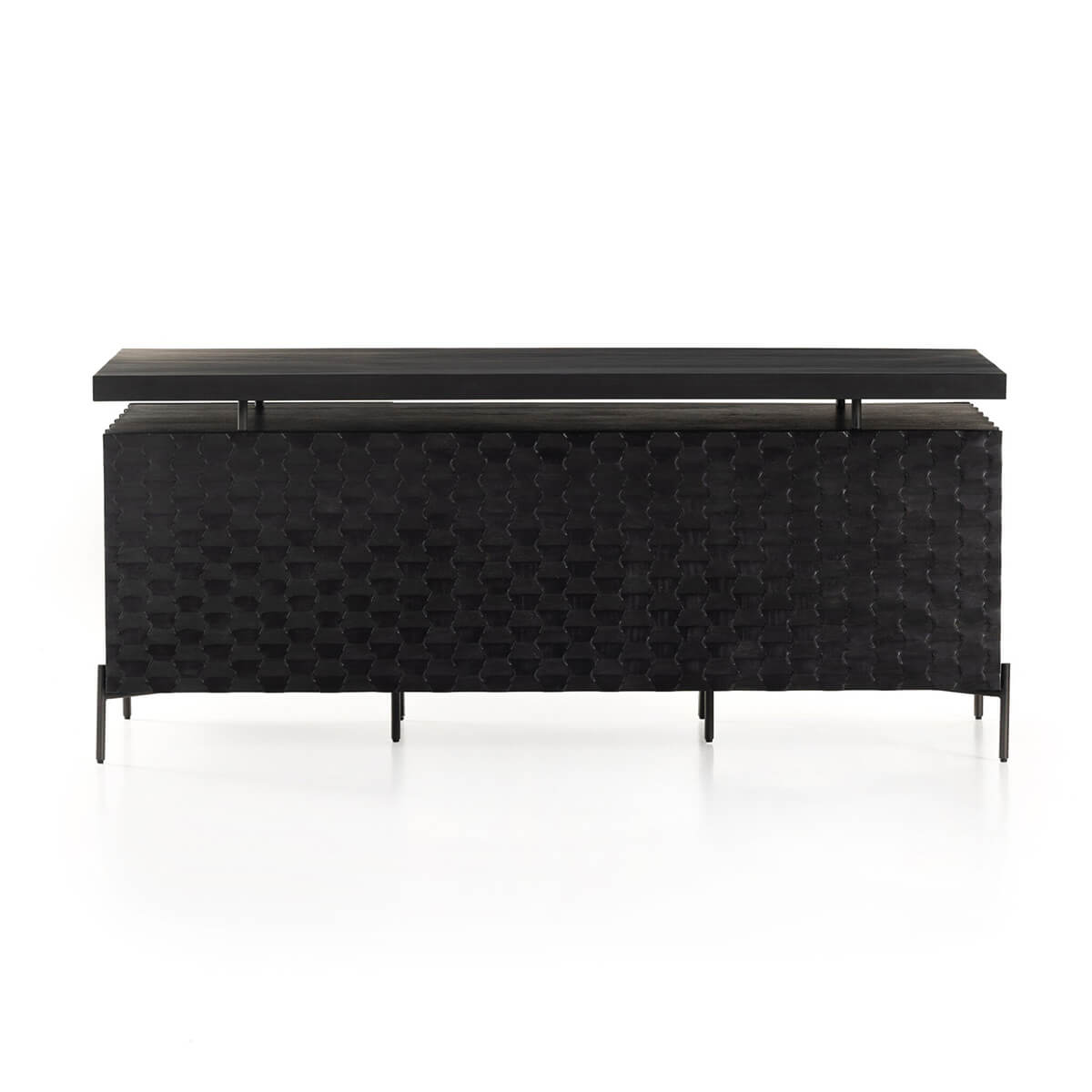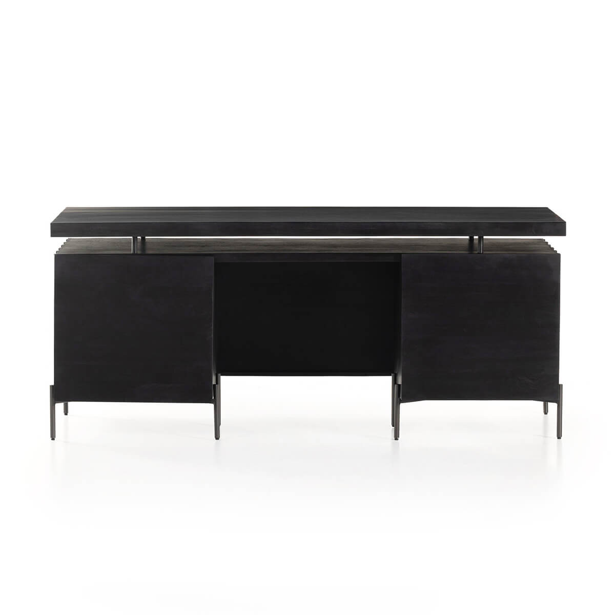 A black-washed two-tier desk features intricate carving for a uniquely textured look and float-like feel. Gunmetal-finished iron legs offer an intriguing material mix with a modern touch.
